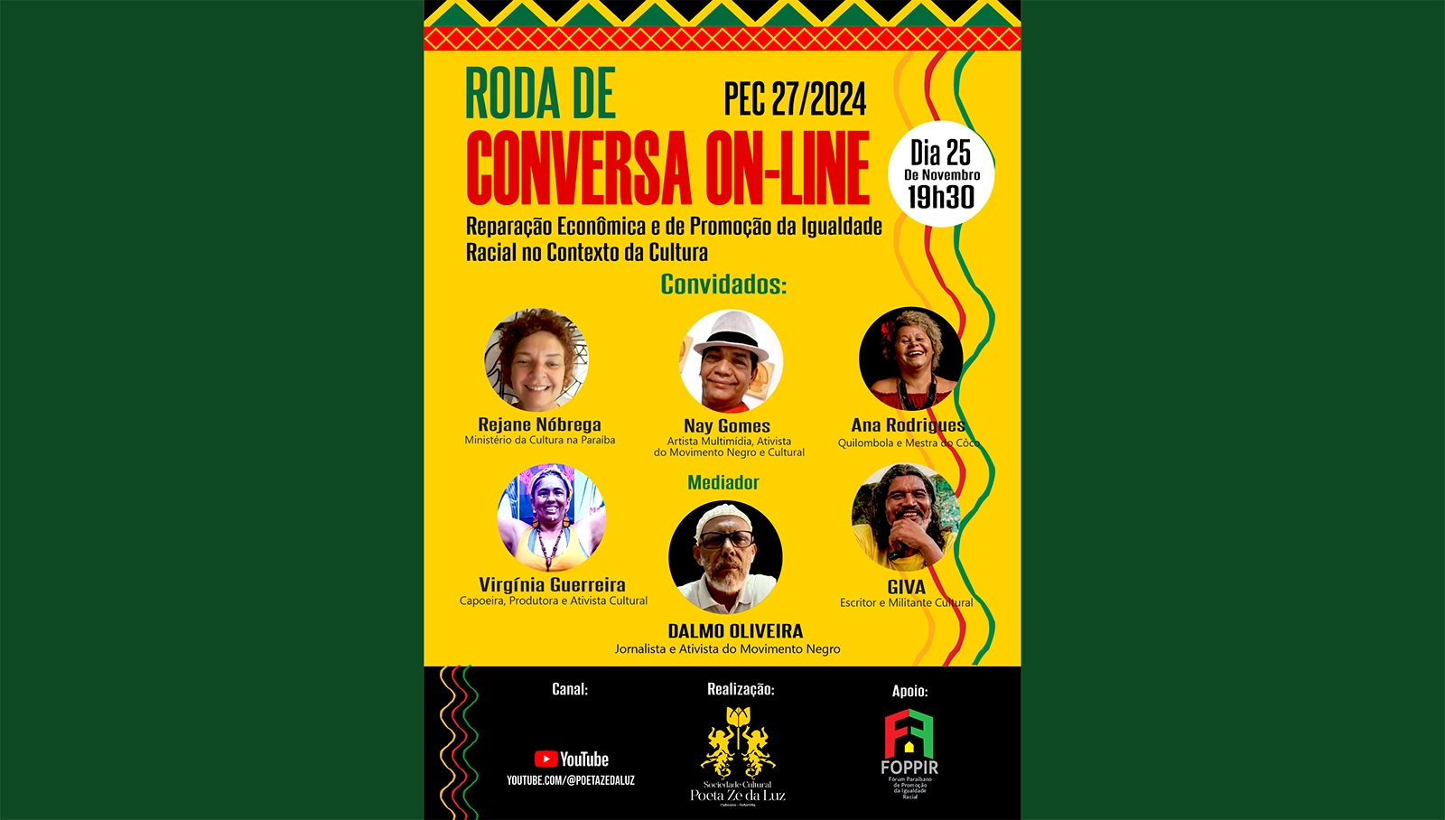 A Sociedade Cultural Poeta Zé da Luz (SCPZL), com o apoio do Fórum Paraibano de Promoção da Igualdade Racial(Foppir), realiza neste dia 25 de novembro, às 19h30, uma roda de conversa online com o tema PEC 27/2024