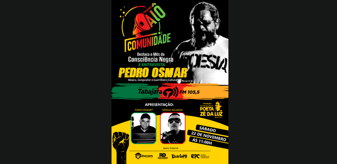 Hoje é dia do músico. O programa “Alô comunidade” traz a fala e arte do grande Pedro Osmar, como homenagem a todos os profissionais e artistas da música. Ouça às 11 horas na Rádio Tabajara: https://radiotabajara.pb.gov.br/radio-ao-vivo/radio-fm