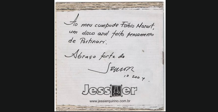 “Ao meu cumpade Fábio Mozart, um disco azul feito pensamento de Portinari. Abraço forte do Jessier Quirino”.