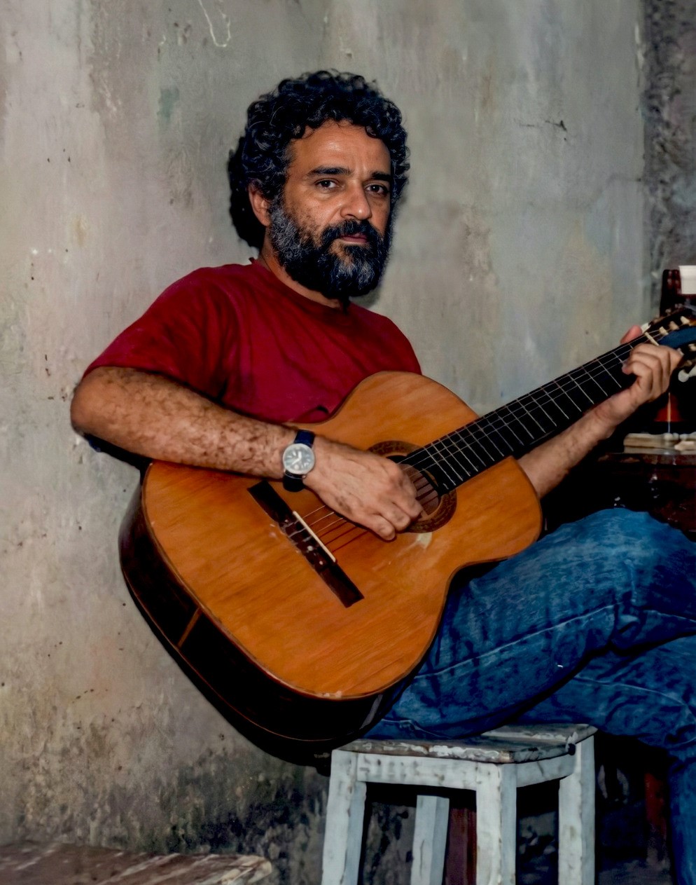 Na foto, eu tocando meu violão vagabundo e brega em algum inferninho de Mari, anos 80/90.