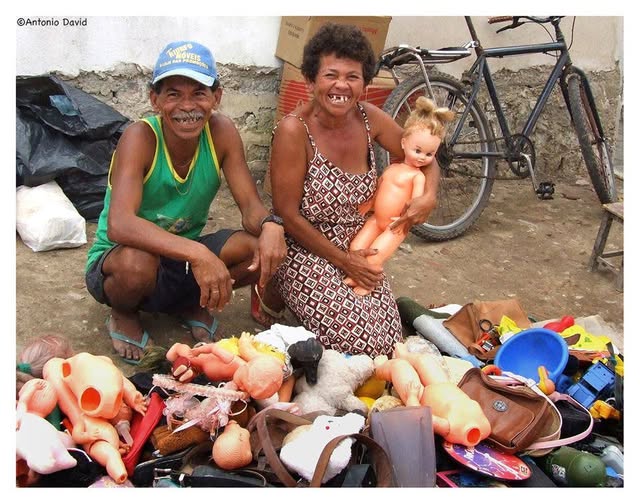 Essas criaturas consertam bonecas na feira de Oitizeiro, em João Pessoa. Concorrem com brinquedos eletrônicos da China. Não é tocante a alma do nordestino? (Foto de Antonio David)
